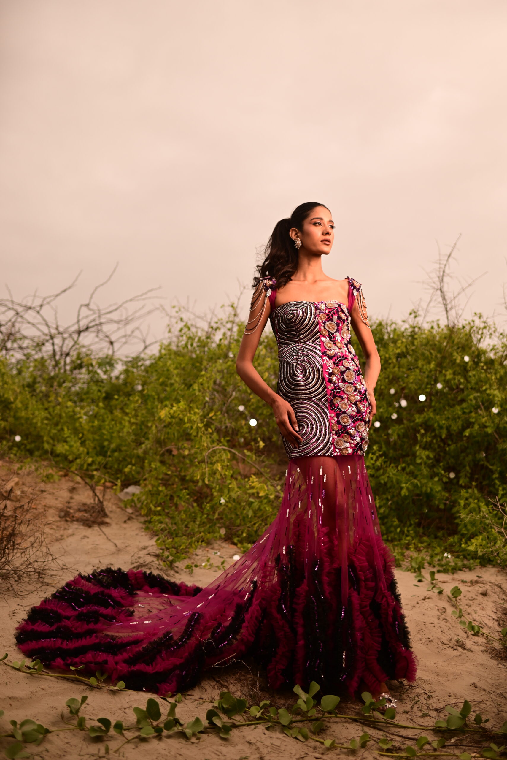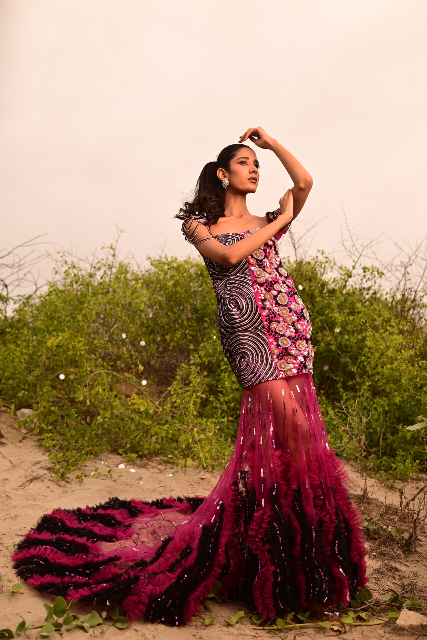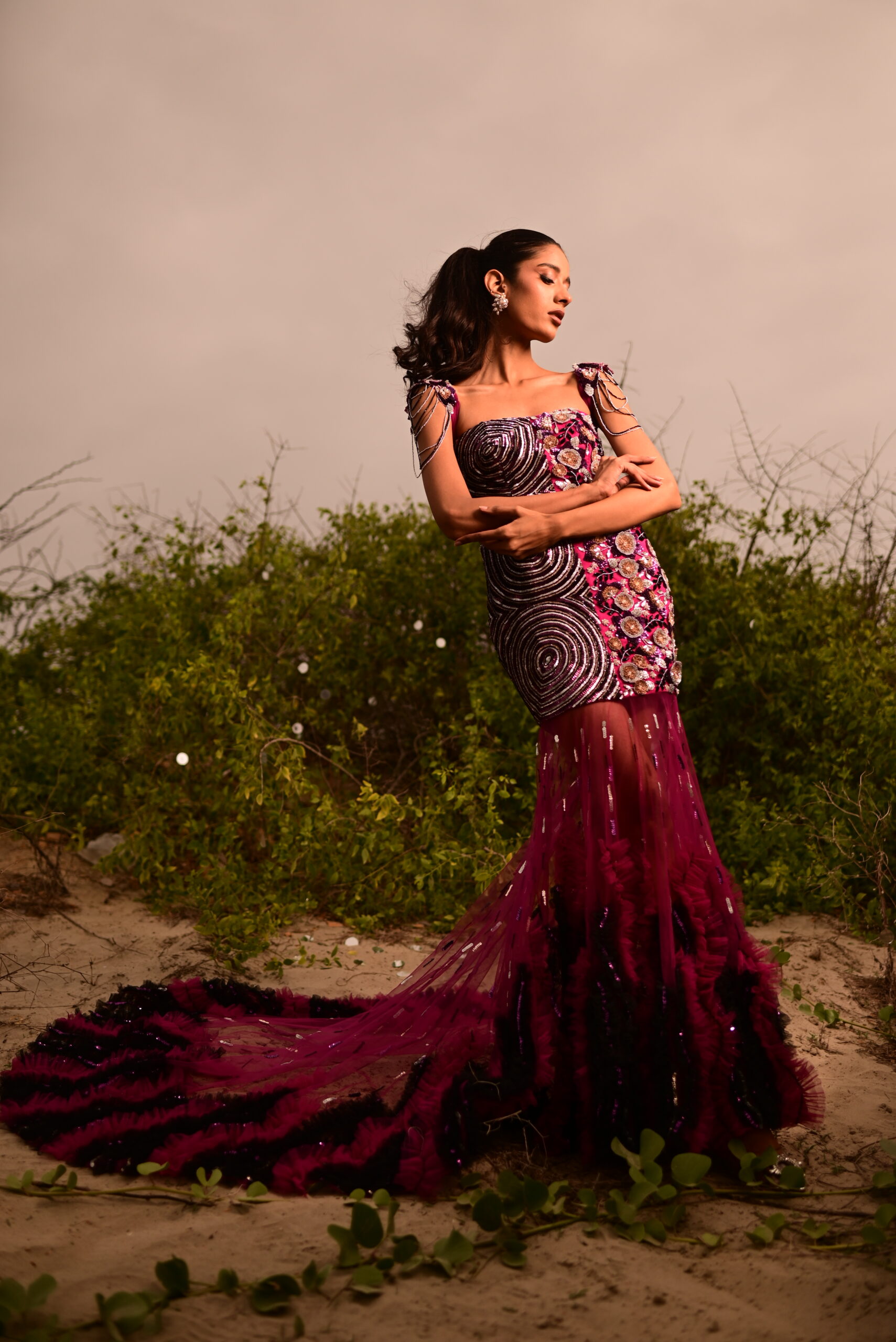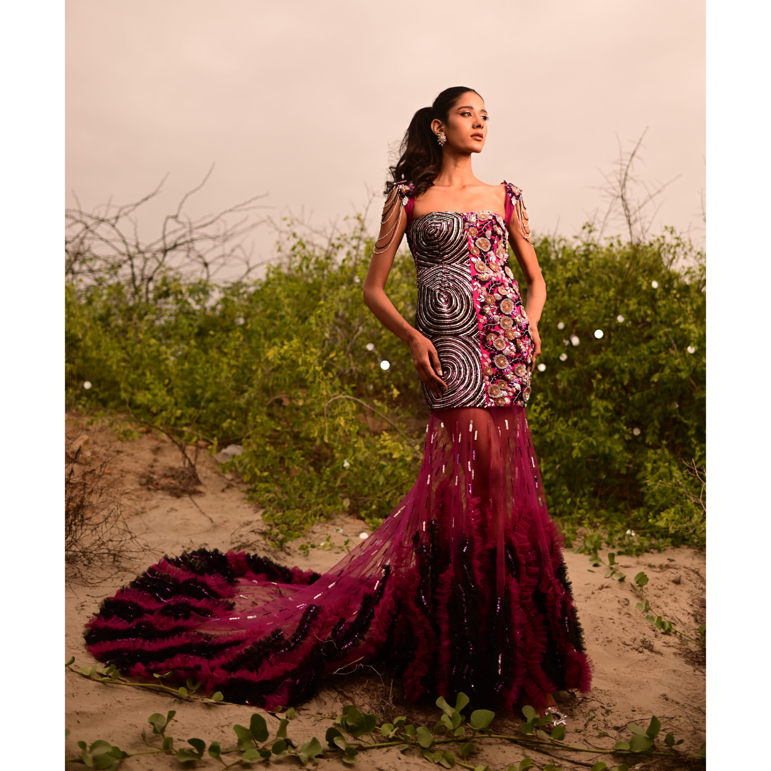 Introducing the 'Magenta Royale' Gown, a masterpiece of design that symbolizes female empowerment. This gown is meticulously embroidered with shining silver beads and sequins, exuding sophistication and power. Its enchanting long train, crafted from sheer net fabric, offers a glimpse of boldness adding a touch of drama and elegance to your walk. Every detail is perfected, making this gown not only a symbol of luxury but also a bold statement piece. Ideal for the bride who wants to captivate or anyone aiming to turn heads, the Magenta Royale is your ticket to commanding attention.