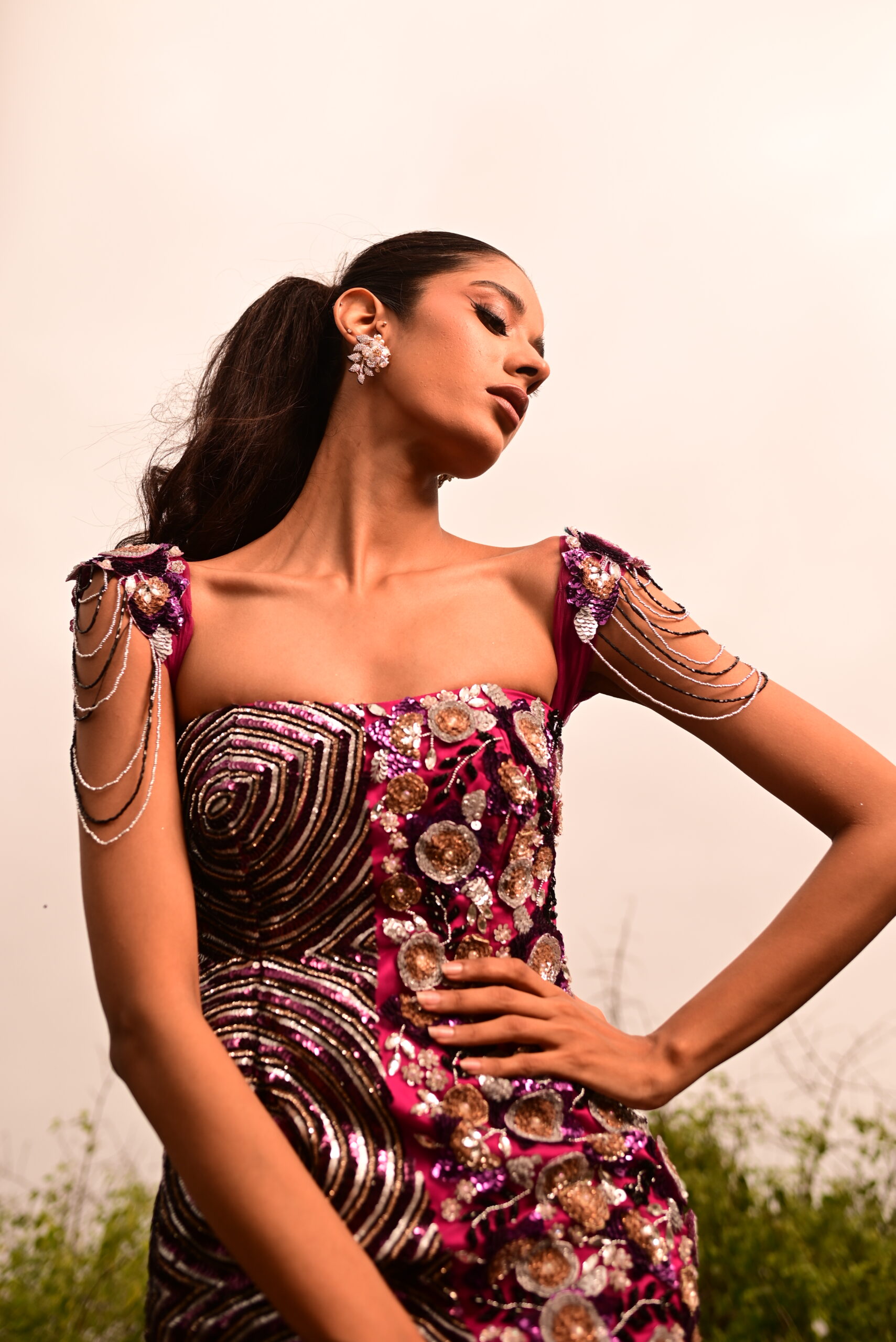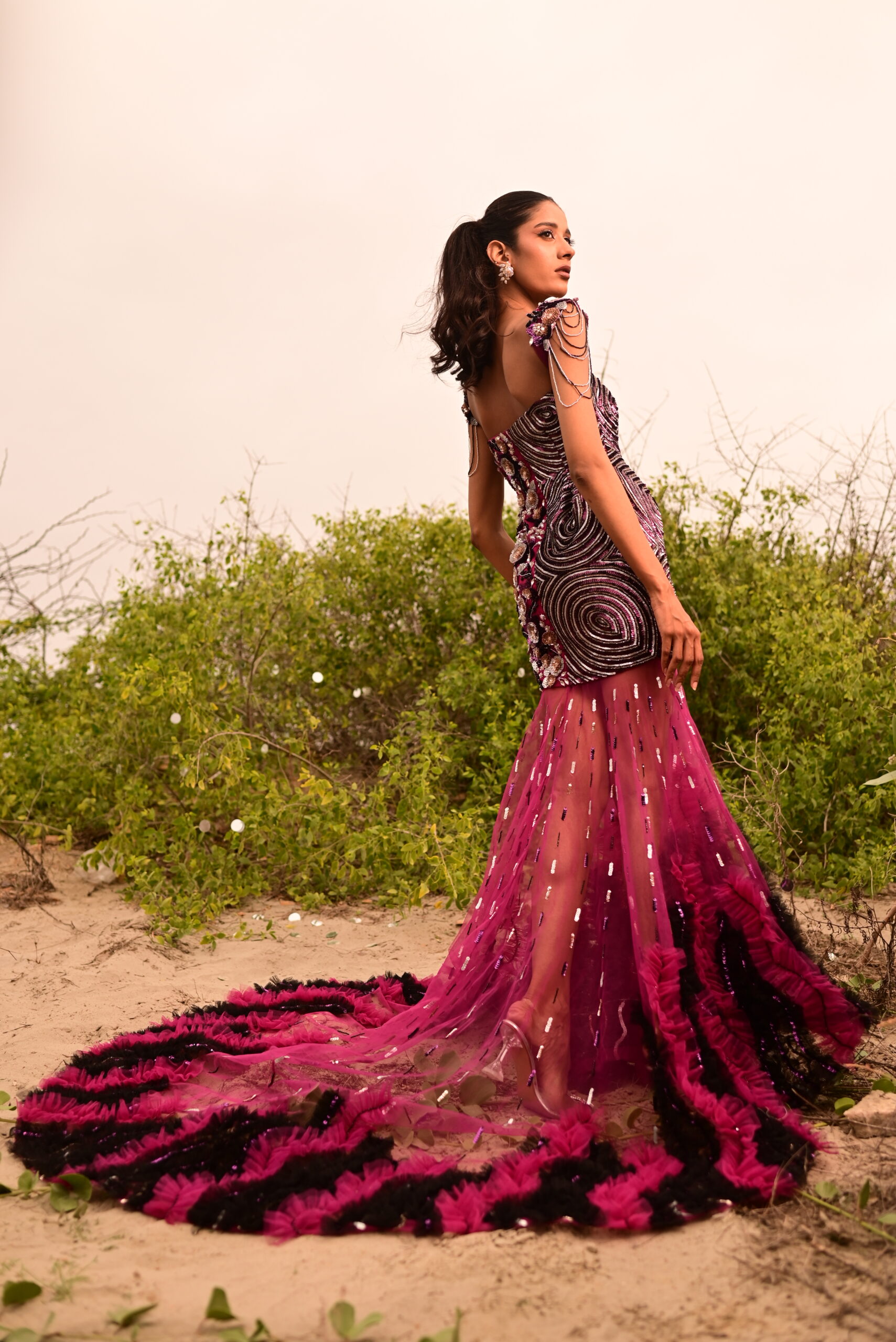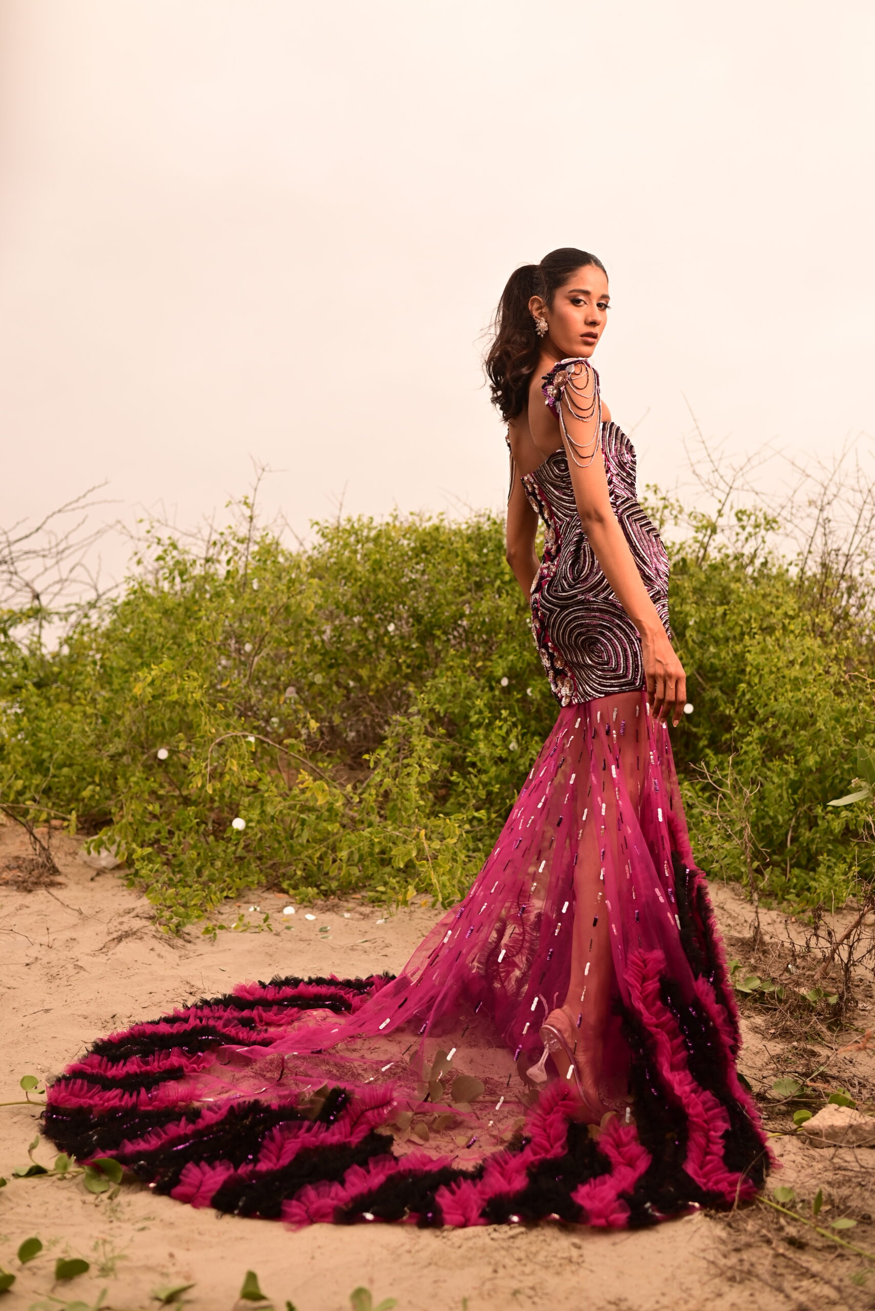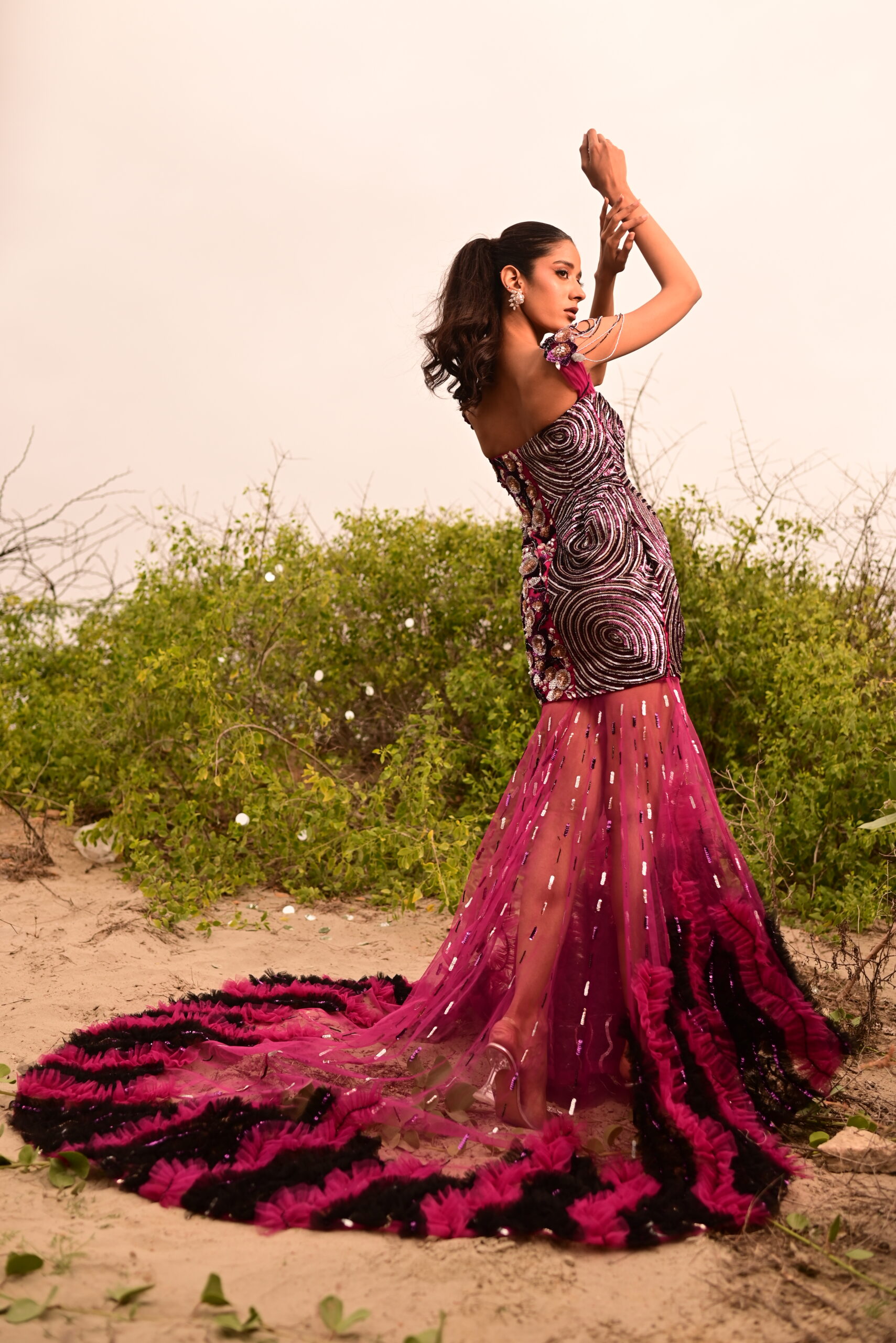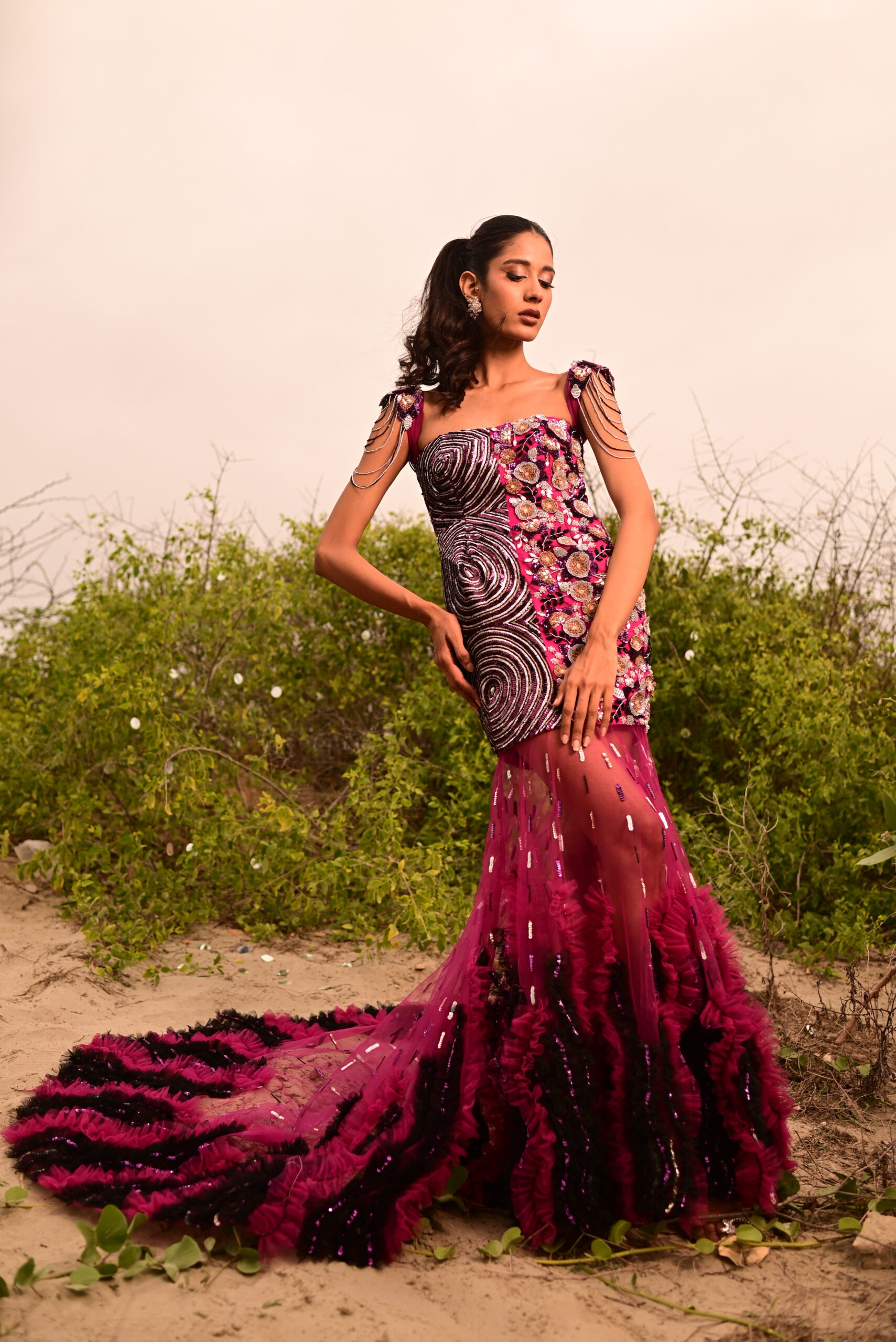 Introducing the 'Magenta Royale' Gown, a masterpiece of design that symbolizes female empowerment. This gown is meticulously embroidered with shining silver beads and sequins, exuding sophistication and power. Its enchanting long train, crafted from sheer net fabric, offers a glimpse of boldness adding a touch of drama and elegance to your walk. Every detail is perfected, making this gown not only a symbol of luxury but also a bold statement piece. Ideal for the bride who wants to captivate or anyone aiming to turn heads, the Magenta Royale is your ticket to commanding attention.